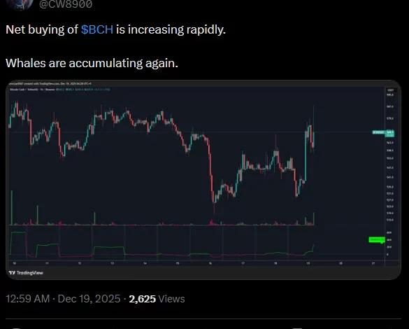 BCH price rallied amid renewed accumulation from whales and large investors, as noted by multiple analysts. Whale buying often spurs demand among retail investors, which can lead to further gains in the short term.