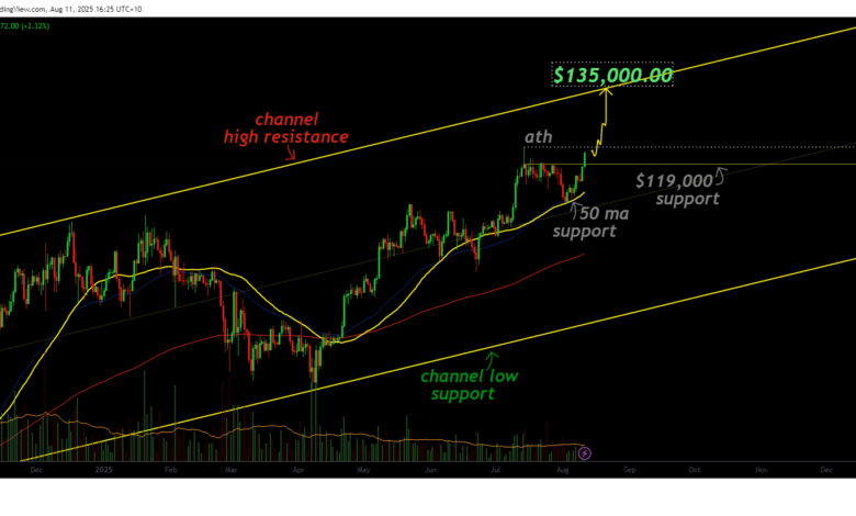 From a technical standpoint, Bitcoin’s price is gravitating toward the upper regions of its trading channel at $135,000. The breakout through prior resistance levels has created a clear path toward the all-time high, and beyond that, the upper boundary of the channel.