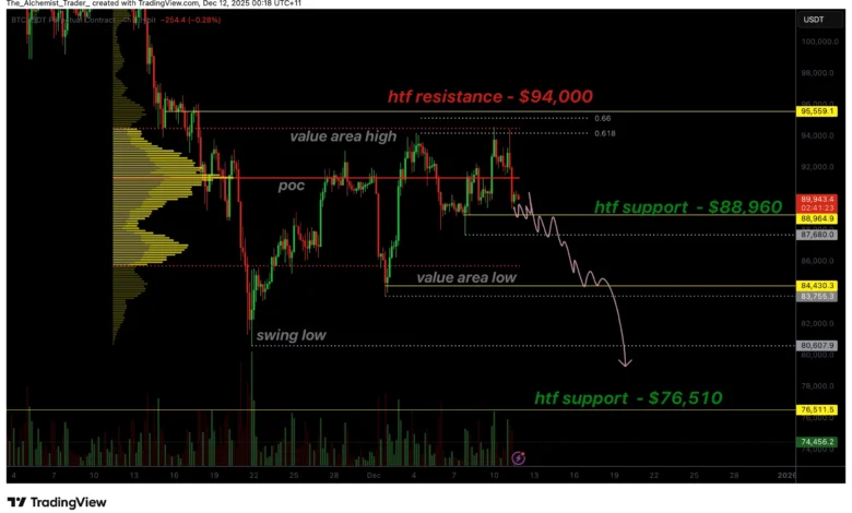 Bitcoin remains in a rotational structure, but unless bulls reclaim the POC and break back above $94,000, downside remains the dominant probability. A breakdown below $88,960 would likely accelerate a move toward $76,510, while a recovery above $94,000 would be needed to confirm any bullish momentum shift.