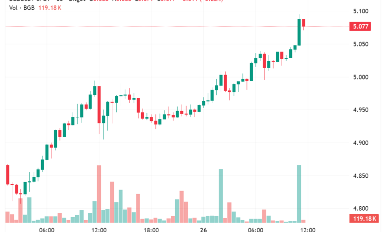 In the past 24 hours, BGB (BGB) has gone up by more than 2%, reaching as high as $5.09. In the past week, the token has soared by 8.14%. Meanwhile, its daily trading volume has gone up by 34.4% to nearly $148 million, indicating an increase in market activity.