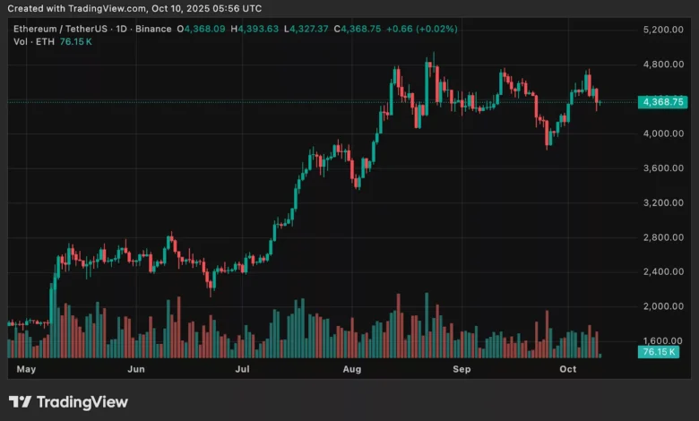 Ethereum is trading at approximately $4,368 at the time of writing, down around 2% on the day, per data from crypto.news. Earlier in the week, the second-largest cryptocurrency reached a local high near $4,645, before retreating to test support at $4,253. This marks a notable pullback from its recent upward momentum, with ETH declining from its intraday peak and consolidating near important support levels.