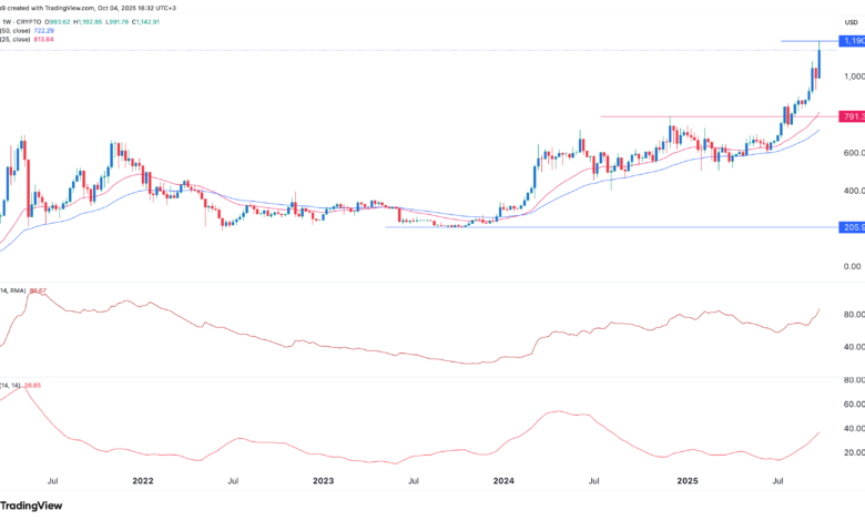 The weekly chart shows that the BNB Coin price has surged in recent months. It has broken above key resistance levels at $1,000 and $791—the highest point since November last year.