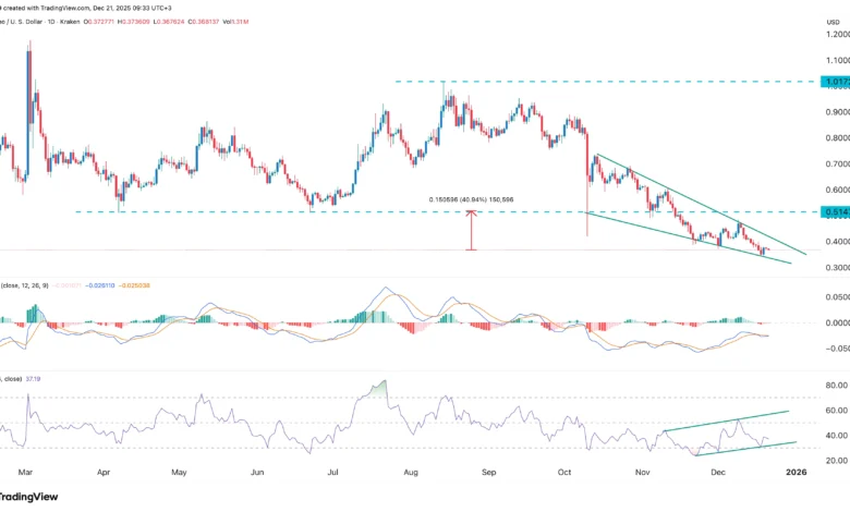 The daily timeframe chart shows that the ADA price has dropped to $0.3680, down sharply from the September high of $1.017. It has formed a falling wedge pattern, which is made of two descending and converging trendlines.