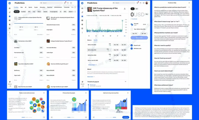 The screenshots show Coinbase developing a dedicated website for the service, featuring Coinbase-branded prediction market pages, an FAQ section, and onboarding guides, according to the leaked images.
