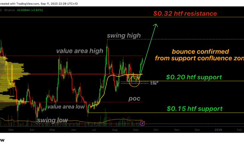 • A breakout above the value area high would open the door for a move toward $0.32, a high-timeframe resistance not yet tested.