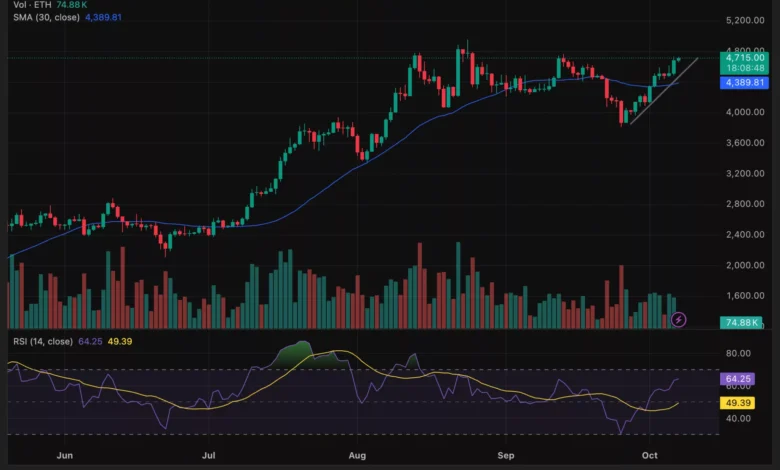 At the time of writing, Ethereum price trades at $4,716, up roughly 4% on the day, per market data from crypto.news. The second-largest crypto asset began its climb at the start of “Uptober,” joining the broader market rally that has seen Bitcoin reclaim new highs and several altcoins post fresh gains.