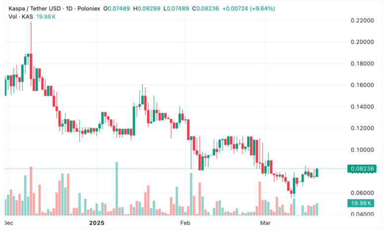Kaspa is gaining traction in the cryptocurrency market, and recent price changes reflect both its potential and volatility. As of March 24, the coin is trading at $0.079, a 21% drop over the last 30 days, and a 5% increase over the last 24 hours.