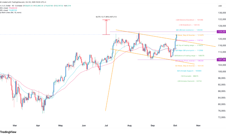 The flag pattern and the Murrey Math Lines analysis point to an eventual Bitcoin surge to $131,250, which is the extreme overshoot level and 7.40% above the current level.