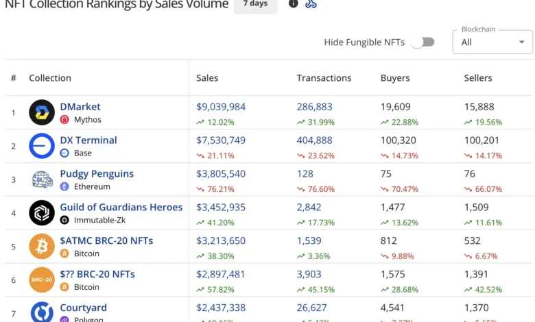 - DMarket topped sales at $9.05M as Pudgy Penguins plunged over 76%.