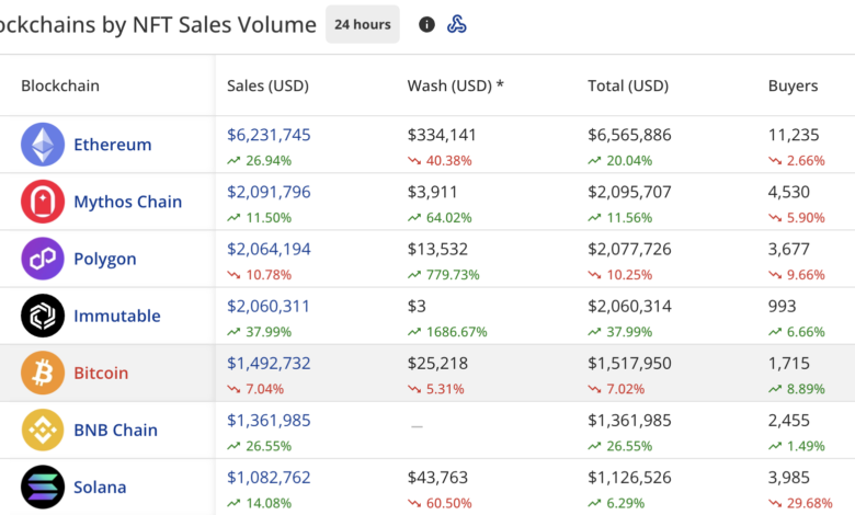 - Ethereum maintains the lead with $34.1 million in sales and dropped 7.45% from the previous week. Ethereum’s wash trading has fallen by 52.47% to $3.1 million.