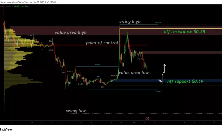 At present, the value area low remains the last region of support preventing a more severe drop. If this level is breached on a daily closing basis, it would open the door for a deeper move toward $0.19, where significant liquidity rests from earlier trading sessions. This $0.19 zone also aligns with prior market activity, making it a likely area for short-term buyers to re-enter.