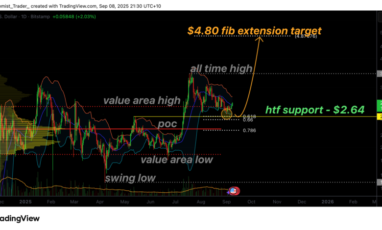 - Critical Support: $2.64 aligns with the 0.618 Fibonacci retracement, lower Bollinger Band, and value area high.