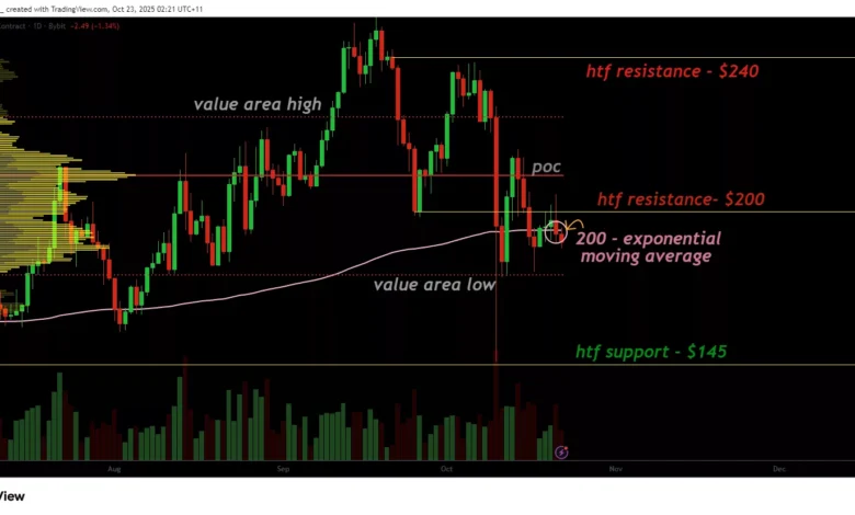 As long as Solana remains below this key average, the probability of revisiting the value area low continues to rise. A breakdown from current levels would likely lead price action toward the $145 support, where a prior swing low was established. This level represents an important structural demand zone that could temporarily halt selling pressure, but if it fails, the bearish continuation could accelerate further.