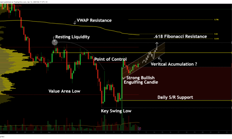 The surge was accompanied by a rising volume profile, confirming buyer interest and demand at that level. Following the push, price now finds itself consolidating near the point of control—typically a sign that the market is building a base, not reversing.