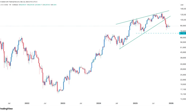 The weekly logarithmic chart indicates that Bitcoin’s (BTC) price slumped over the past few months. It has dropped from a high of $126,200 in October to the current $89,300.