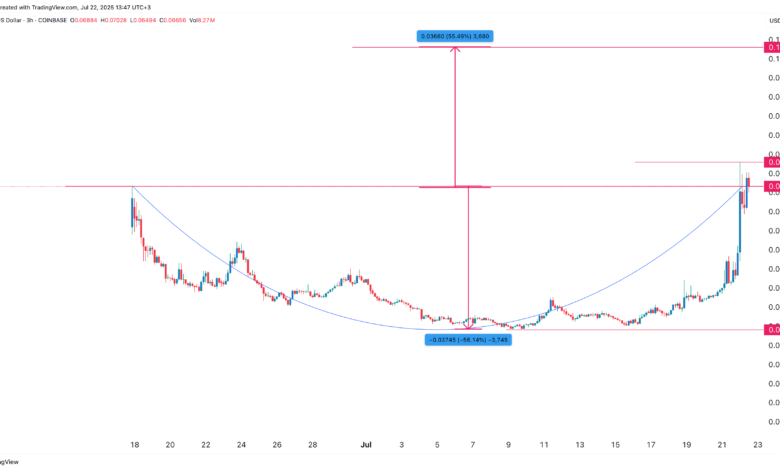 The three-hour chart shows that the Spark token price has staged a strong recovery after bottoming at $0.029 on July 9. It has slowly formed a cup-and-handle pattern, a popular bullish continuation sign in technical analysis.