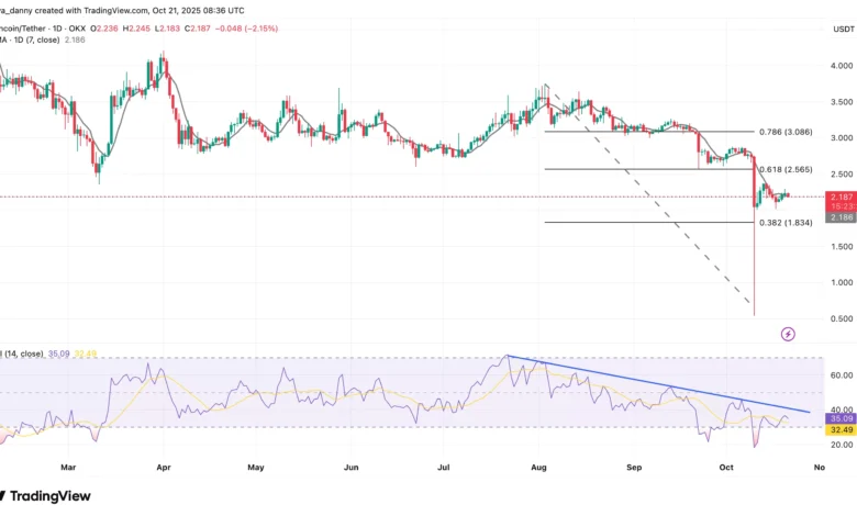 If buying pressure fails to strengthen, a rejection near the $2.50 resistance zone could trigger a renewed decline toward the next Fibonacci support around $1.83. A break below that level would further confirm the bearish continuation pattern, potentially setting the stage for a deeper retracement toward the $1.50 region.